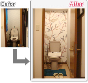 ドアを開けた正面に思い切って、大柄のクロスを使用しました。内装を変えただけですが、トイレの雰囲気もすっかり変わりました。